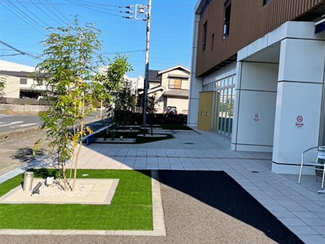 雑草が発生しないように人工芝を敷設し植栽は株立ちの樹木(シマトネリコ4本・ヒメシャラ3本)に変更。合わせて樹木周りは化粧砂利にて美観向上、夜間はスポットライトが自動点灯しライティング効果を演出しました。